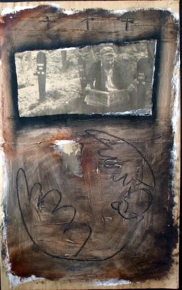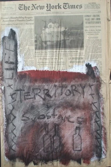 My New York Times series bagan in the late eighties in Williamsburg, Brooklyn, and continued through the nineties. These works are not collages, the painting and scratch drawings are made around the images and/or texts. These works are on the spot responses to daily events or simply, use of the images as graphic content beside an all together different context. There are over two hundred pieces in this series.